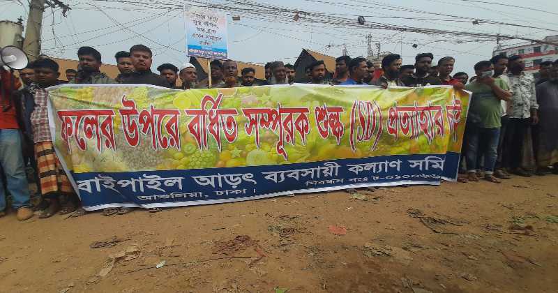 সাভারের আশুলিয়ায় ফলের ওপর বর্ধিত সম্পূরক শুল্ক প্রত্যাহারের দাবিতে মানববন্ধন কর্মসূচি পালন করেছে স্থানীয় ফল ব্যবসায়ীরা।