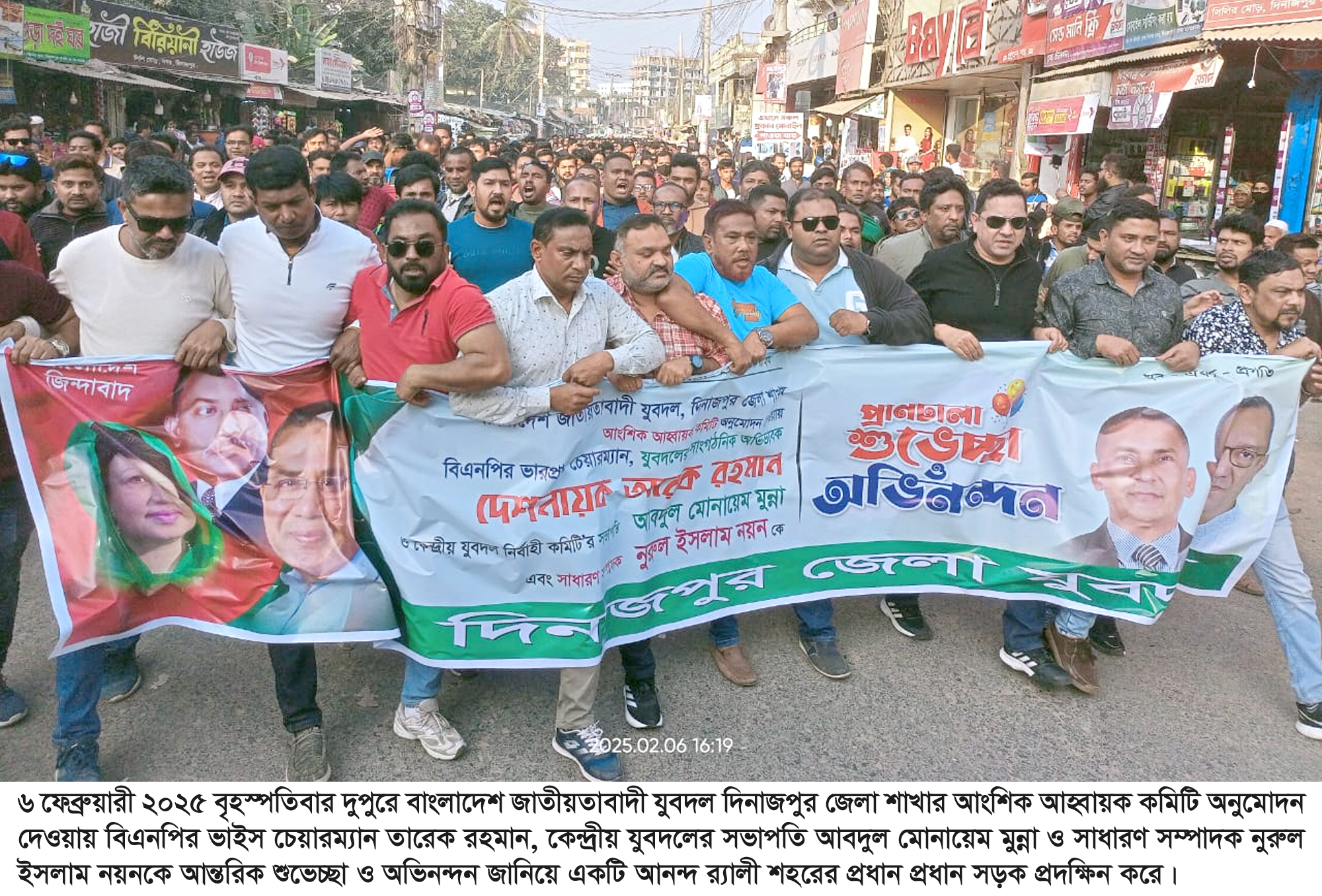 ৬ ফেব্রুয়ারী ২০২৫ বৃহস্পতিবার দুপুরে জেলরোডস্থ দিনাজপুর জেলা বিএনপির কার্যালয় হতে বিকেল ৪টায় একটি আনন্দ র‌্যালী বের হয়ে শহরের লিলিমোড়, বাহাদুর বাজার, সদর হাসপাতাল মোড়, মুন্সিপাড়া, মালদাহপট্টি, চারুবাবুর মোড় ও মর্ডাণ মোড় হয়ে দলীয় কার্যালয়ে এসে শেষ।