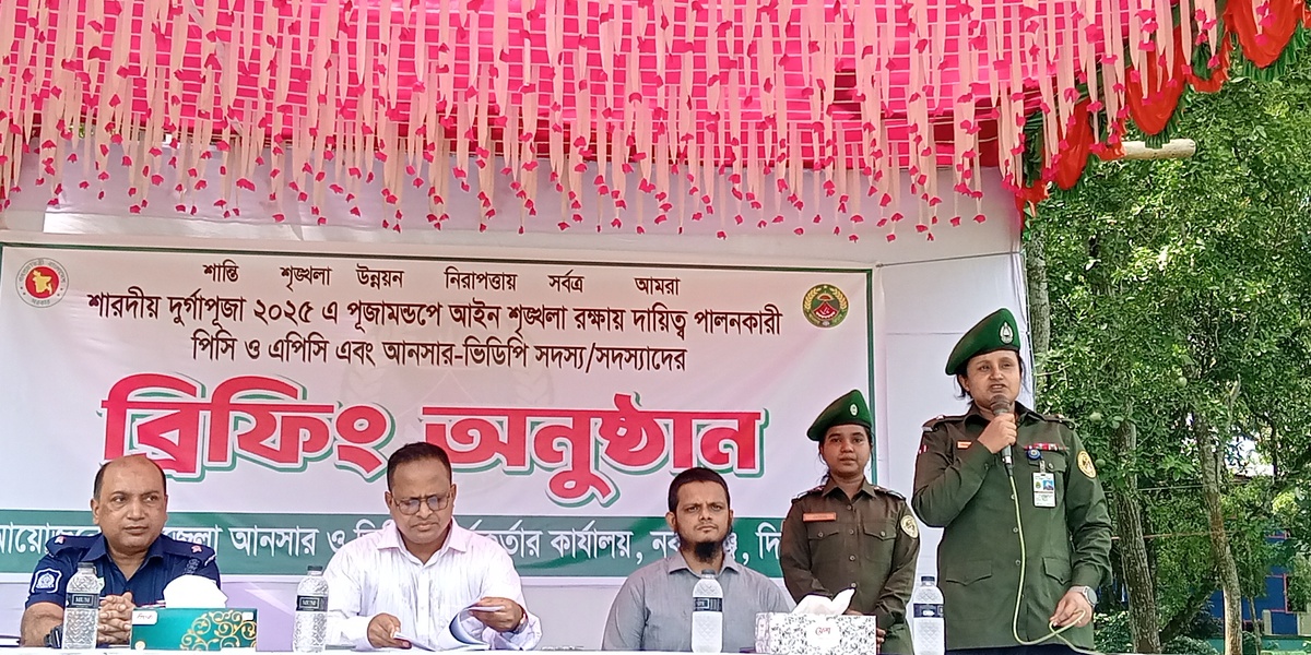 সামনে শারদীয় দুর্গা পূজায় আইন-শৃঙ্খলা পরিস্থিতি স্বাভাবিক রাখতে আনসার-ভিডিপি সদস্যদের ব্রিফিং দিয়েছেন উপজেলা আনসার-ভিডিপি কর্মকর্তা মোছাঃ রেজেনা পারভীন আক্তার।বুধবার দুপুর ১২ টায় উপজেলা শিশু পার্ক চত্বরে দায়িত্ব প্রাপ্ত সদস্যদের উদ্দেশ্যে ব্রিফিংয়ে তিনি বলেন- সাম্প্রদায়িক সম্প্রীতির দেশ হিসেবে বাংলাদেশ পৃথিবীতে মাথা উঁচু করে আছে। কোন অপশক্তিকে আমাদের সাম্প্রদায়িক এ সম্প্রীতিকে বিনষ্ট করতে দেওয়া হবে না। তাই এবারের শারদীয় দুর্গোৎসবে উপজেলার ৬৮ পূজা মন্ডপের আইন শৃঙ্খলা বজায় রাখতে পুলিশ ও আইন শৃঙ্খলা রক্ষাকারী বাহিনীর সাথে কাঁধে কাঁধ মিলিয়ে মন্ডপে আগত জনসাধারণের জানমাল রক্ষার দায়িত্ব পালনে আপনাদের সর্বদা সচেষ্ট হতে হবে। কারও কোন সমস্যা হলে আমাকে ফোন করে জানাতে হবে।এসময় উপস্থিত ছিলেন উপজেলা নির্বাহী অফিসার মোঃ জিল্লুর রহমান ও নবাবগঞ্জ উপজেলা ভুমি কর্মকর্তা মোঃ মুনতাসীর মাহফুজ ও নবাবগঞ্জ থানা অফিসার ইনচার্জ ওসি আঃ মতিন ও সংশ্লিষ্ট ইউনিয়ন দলনেতা ও দলনেত্রী বৃন্দ। উপজেলা আনসার-ভিডিপি কর্মকর্তা মোছাঃ রেজেনা পারভীন আক্তার সাংবাদিকদের জানান- এবার পূজায় আমাদের আনসার-ভিডিপি সদস্যদের মধ্যে যাচাই-বাছাই করে প্রশিক্ষণ প্রাপ্ত ৪২৮ জনকে তাদের দায়িত্ব বুঝে দিয়েছি।