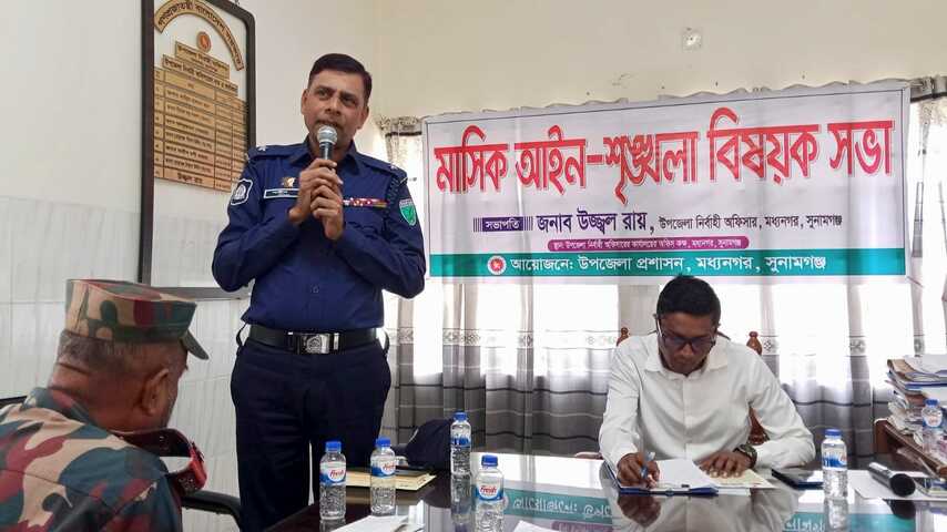 সুনামগঞ্জের মধ্যনগরে মাসিক আইন-শৃঙ্খলা বিষয়ক সভা অনুষ্ঠিত হয়েছে। সভার সভাপতিত্ব করেন উপজেলা নির্বাহী কর্মকর্তা (ইউএনও) উজ্জ্বল রায়।বুধবার (১৪ জানুয়ারি) দুপুরে উপজেলা নির্বাহী কর্মকর্তার কার্যালয়ের অফিস কক্ষে সভাটি আয়োজন করে উপজেলা প্রশাসন, মধ্যনগর।সভায় উপস্থিত ছিলেন উপজেলার জনপ্রতিনিধি, রাজনৈতিক নেতৃবৃন্দ, মুক্তিযোদ্ধা প্রতিনিধি, বিজিবি প্রতিনিধি, উপজেলা শিক্ষা কর্মকর্তা, বিভিন্ন দপ্তরের প্রধান এবং প্রিন্ট ও ইলেকট্রনিক মিডিয়ার সাংবাদিকরা।সভায় আলোচনা হয় উপজেলার সার্বিক আইন-শৃঙ্খলা পরিস্থিতি, চুরি-ডাকাতি রোধ, মাদক নির্মূল, বাল্যবিবাহ প্রতিরোধ, সড়ক নিরাপত্তা, বাজার মনিটরিং, আসন্ন বিভিন্ন কর্মসূচিতে নিরাপত্তা ব্যবস্থা এবং জনসচেতনতামূলক কার্যক্রম নিয়ে।ইউএনও উজ্জ্বল রায় বলেন, “আইন-শৃঙ্খলা রক্ষায় প্রশাসন, জনপ্রতিনিধি ও সাধারণ মানুষের সম্মিলিত উদ্যোগ অপরিহার্য। মাদক, বাল্যবিবাহসহ সামাজিক অপরাধ প্রতিরোধে সবাইকে সচেতন ও দায়িত্বশীল ভূমিকা পালন করতে হবে।” তিনি সংশ্লিষ্ট দপ্তরের কর্মকর্তাদের আরও সক্রিয়ভাবে দায়িত্ব পালনের নির্দেশ দেন এবং যেকোনো অনিয়মের বিরুদ্ধে কঠোর ব্যবস্থা নেওয়ার আশ্বাস দেন।সভা শেষে আইন-শৃঙ্খলা পরিস্থিতি স্বাভাবিক রাখতে গৃহীত সিদ্ধান্ত দ্রুত বাস্তবায়নের ওপর গুরুত্বারোপ করা হয়।